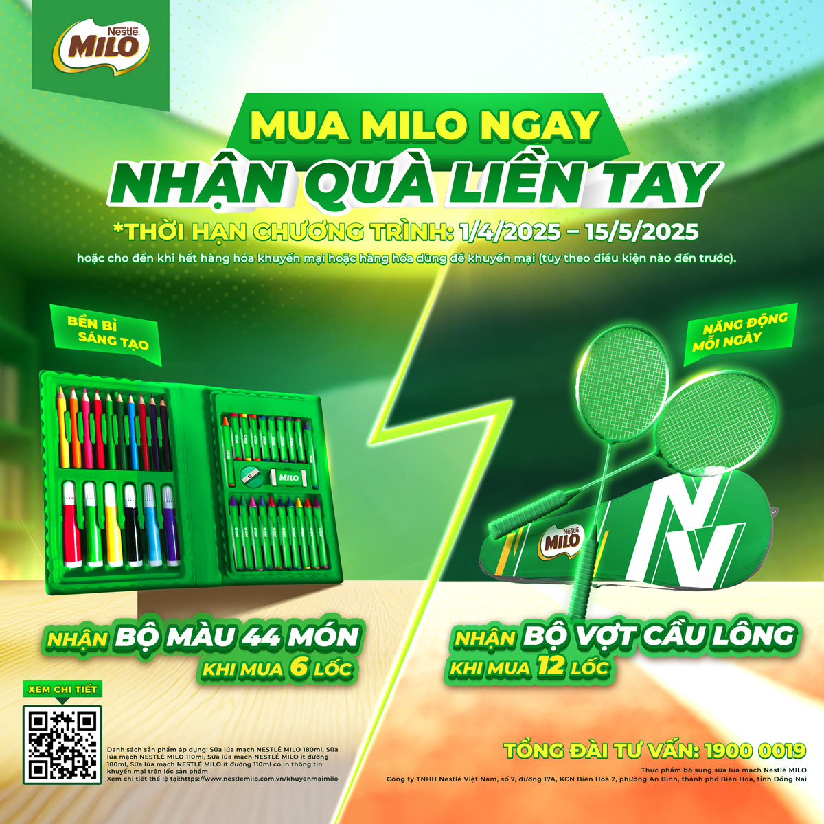 Hot! MILO khuấy động mùa hè với vô vàn quà xịn cho bé! Từ 01/04/2025 đến 15/05/2025, chỉ cần mua MILO, mẹ sẽ có cơ hội rinh ngay bộ vợt cầu lông xịn sò hay bộ màu sáng tạo cho bé yêu. Đừng bỏ lỡ cơn sốt này! Chốt đơn ngay MILO để vừa tiếp thêm năng lượng bền bỉ cho con - vừa săn quà mê ly mẹ nhé!