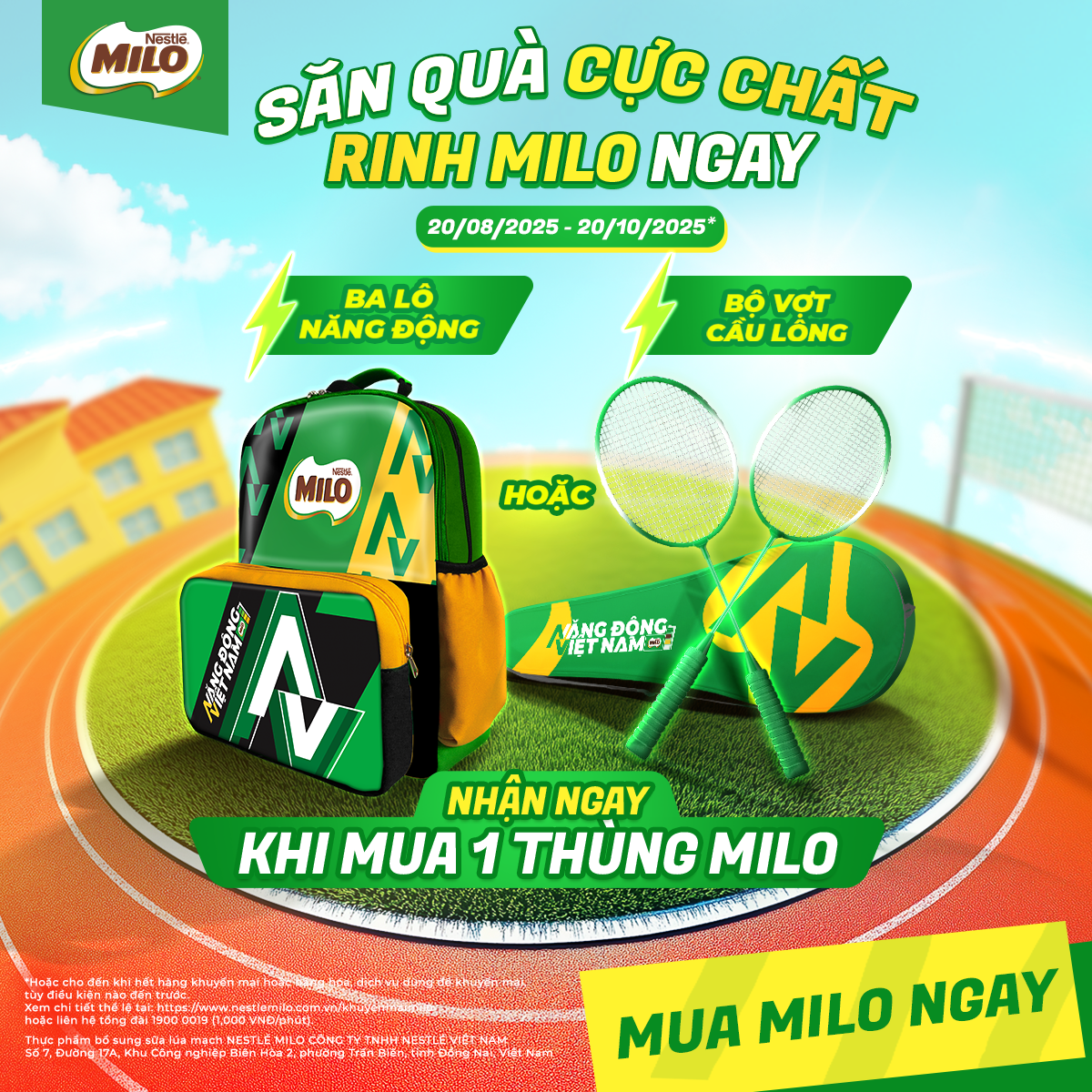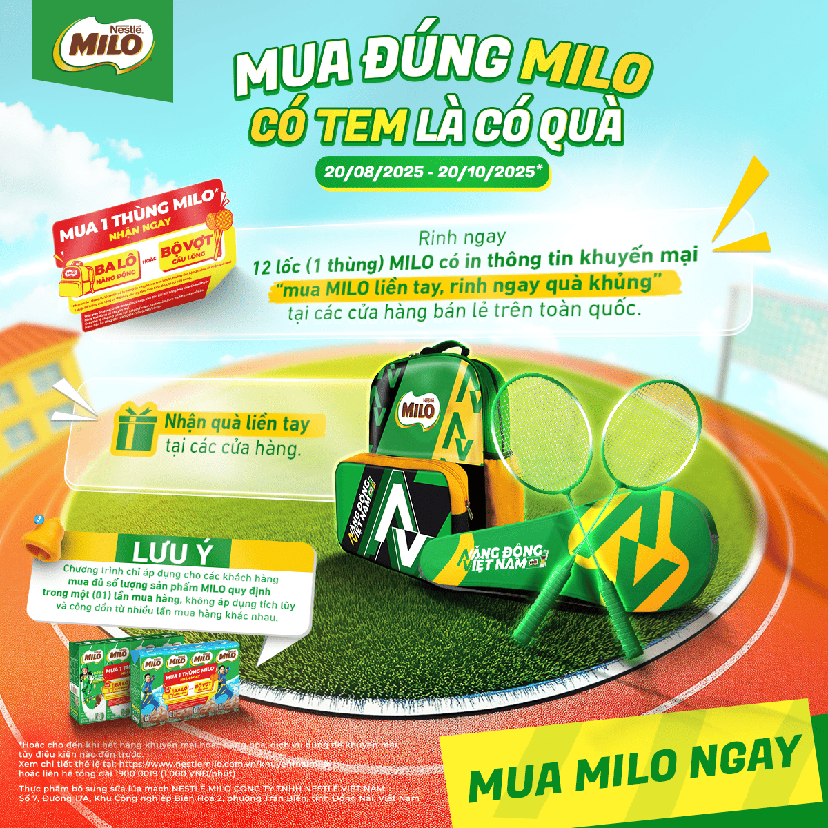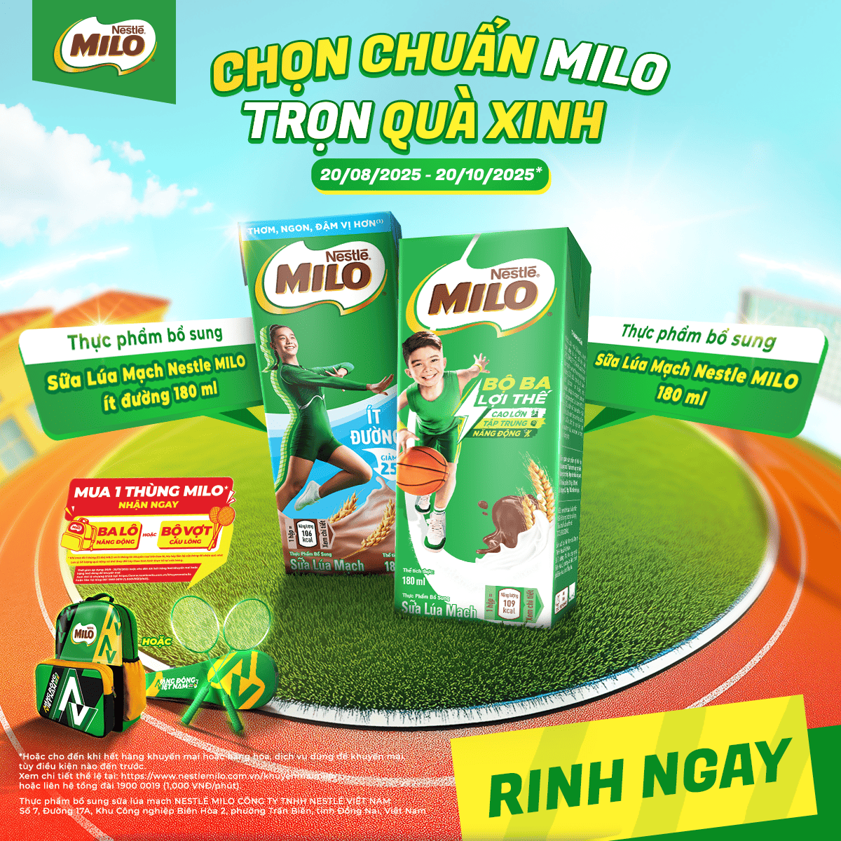 Cơn sốt MILO đã trở lại! "Back to school" rộn ràng với loạt quà xịn cho bé. Từ 20/08 đến 20/10/2025, chỉ cần mua 1 thùng (12 lốc) MILO 180ml có in thông tin khuyến mại - mẹ sẽ cóngay cơ hội nhận balo năng động hoặc bộ vợt cầu lông xịn sò cho bé cưng. Quá ngầu phải không nào, chốt đơn liền mẹ ơi!